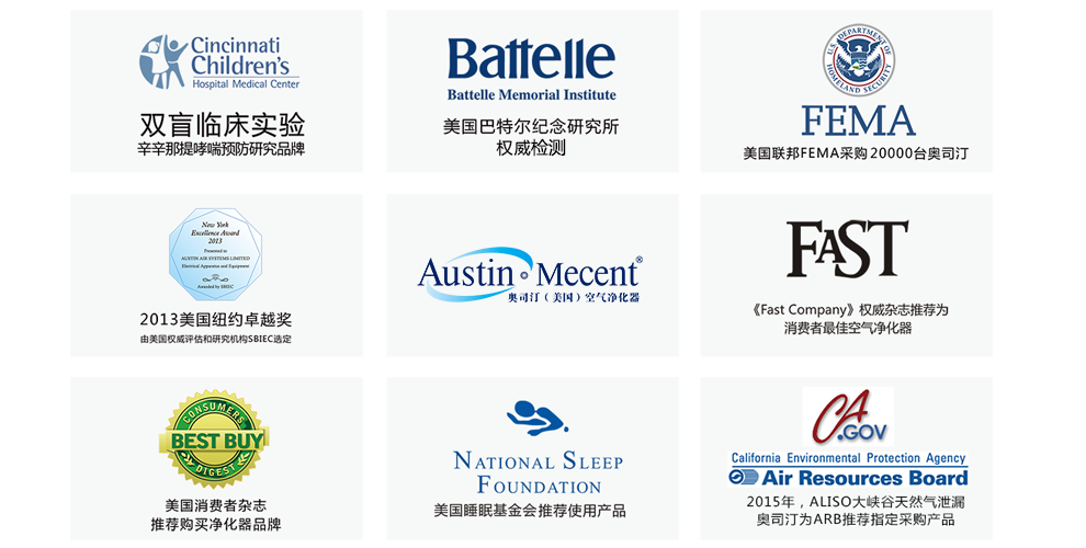 2001年,由美國國家衛生研究院出資發起的Cincinnati Asthma Prevention Study(辛辛那提哮喘預防研究)在美國辛辛那提兒童醫院醫療中心進行隨機雙盲測試,經過為期2年的嚴謹檢測和試驗研究,美國奧司汀空氣凈化器被證明能明顯減少哮喘發病率和降低空氣污染物水平。